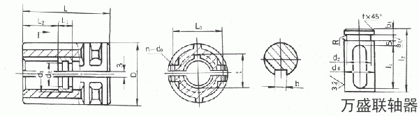 JQ型-夾殼連軸器 (HG5-213-65) 立式夾殼聯軸器的得特性與夾殼聯軸器近似,結構簡單,裝拆方便,適用于低速(*高圓周線速度為5M/S),無沖擊,振動載荷平穩的場合,宜用于攪拌器等立軸的聯接。 夾殼聯軸器是利用兩個沿軸向剖分的夾殼,用螺栓夾緊以實現兩軸聯接,靠兩半聯軸器表面間的摩擦力傳遞轉矩,利用平鍵作輔助聯接。夾殼連軸器裝配和拆卸時軸不需軸向移動,所以裝拆很方便,夾殼連軸器的缺點是兩軸軸線對中精度低,結構和形狀比較復雜,制造及平衡精度較低,只適用于低速和載荷平穩的場合,通常*大外緣的線速度不大于 5m/s ,當線速度超過 5m/s 時需要進行平衡校驗。