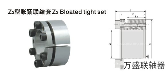 特性: Z3型脹緊內外錐環用內六角螺栓擰緊,能傳遞較大載荷,并且一個錐環上有拆卸螺紋孔;Z3型結合面較長,對中性好,適用于旋轉精度要求較高和傳遞大載荷的場合。